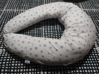 Cojín ergonómico multifuncional con un divertido estampado de estrellas grises sobre fondo blanco. Ideal para el embarazo y la lactancia. - Muy poco uso - Funda extraible y lavable con estampado de estrellas. - Diseño en forma de U.