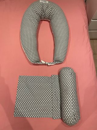 Cojín versátil para embarazo y lactancia. Solo utilizado una vez , perfecto para dormir . Me lo regalaron muy tarde y sin ticket - Diseño en forma de U. - Funda con estampado de lunares blancos sobre fondo gris. - Cierre de botón a presión.