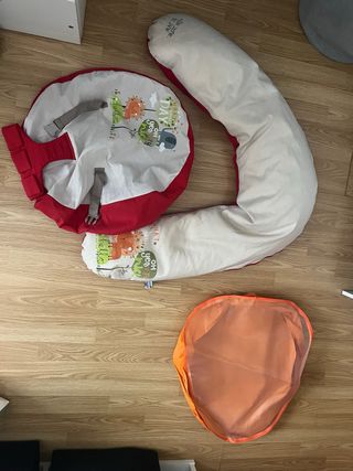 Vendo cojín de lactancia para bebé, en buen estado, con su funda. Incluye también una bolsa de transporte. - Cojín de lactancia en forma de U. - Funda extraíble y lavable. - Bolsa de transporte naranja. - Se puede dejar al bebé como si fuese un puff con arnés.