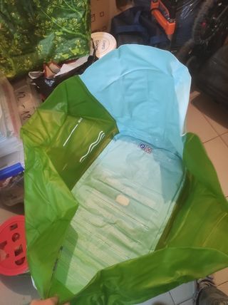 Bañera hinchable Jané en tonos verde y azul. En perfecto estado, para los primeros meses y hasta el año mas o menos va fenomenal. Tiene un cojin hinchable que pegandolo en el velcro hace como de tope que segun crecen se retira