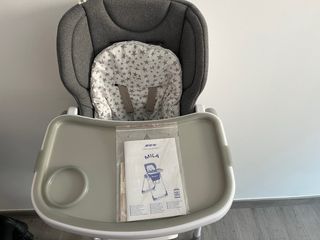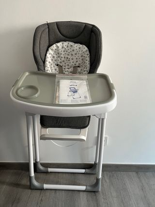 Trona Jane Mila en color gris y blanco. Incluye cojín y bandeja. - Plegable para un fácil almacenamiento. - Incluye manual de instrucciones