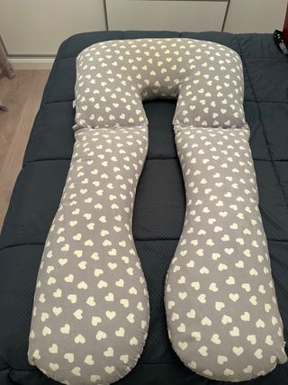 Almohada para dormir durante el embarazo más cómodamente y posteriormente se puede usar como cojin de lactancia y usarlo el tummy time con el bebé. Esta como nuevo, y va en su bolsa original para que al guardarlo ocupe menos e incluye dos fundas grises de lunares blancos para poderlas ir cambiando al lavarlas