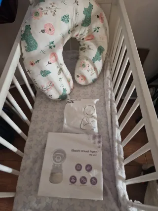 -trona IKEA y cojín de lactancia 10 €. - Cojín blanco en forma de U 10€ - estractor de leche con botella adicional 15€