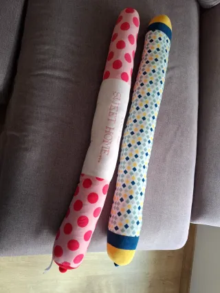 Dos cojines de lactancia de Lidl. Uno tiene un estampado de lunares rosas y el otro un diseño de rombos en varios colores. 5 euros cada uno - Cojín con lunares rosas y banda central con texto. - Cojín con estampado de rombos en azul, amarillo y blanco. - Tapas en los extremos de ambos cojines.