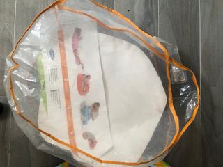Cojín lactancia blanco con estampado de dibujos infantiles en color azul. Funda desmontable con cremallera que facilita el lavado. Tiene alguna pequeña mancha del uso que yo creo que se podría quitar al sol, pero debido a la climatología actual no he podido. Muy mullido y cómodo.