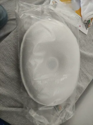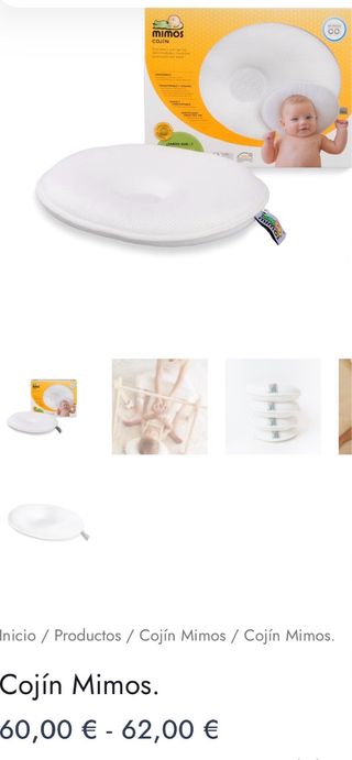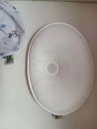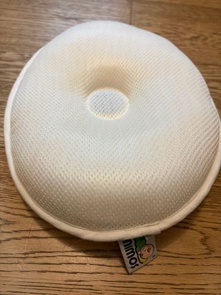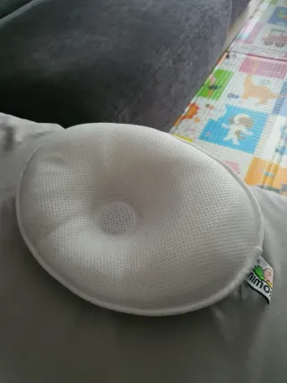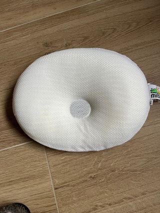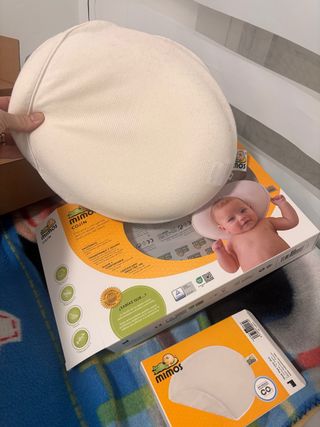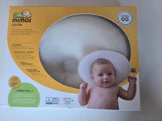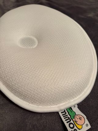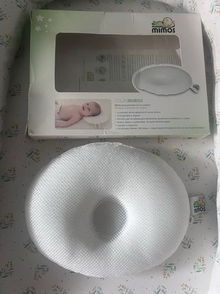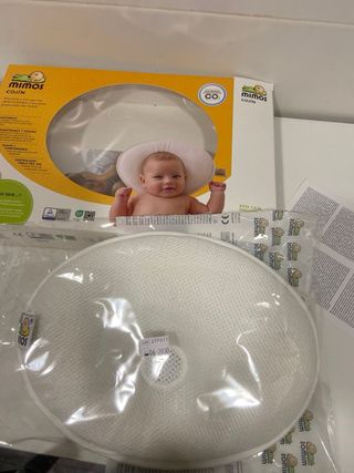 Cojín ergonómico Mimos para bebés, diseñado para el confort y la prevención de la plagiocefalia. - Tejido transpirable. - Forma contorneada. - Color blanco. Fue utilizado una única vez de verdad. Entre que lloraba mucho en el moisés y nuestro pediatra definitivo nos dijo que en su cuna no era necesario, ya no lo volvimos a usar. Nos costó 65€ en amazon.