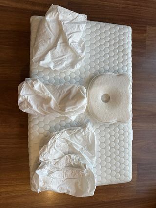 Colchón para cuna de la marca Ecu Kids, modelo Mimo Peti. Incluye funda protectora, bajera y un cojín para plagiocefalia. 4 meses de uso con funda protectora. No tiene ninguna mancha. - Colchón de espuma. - Funda de tela. - Diseño hexagonal.