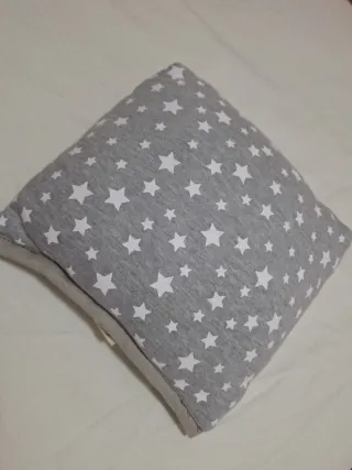 Cojín reductor marca BELLOCHI con un suave estampado de estrellas grises sobre fondo blanco. Diseñado para ofrecer comodidad y seguridad. - Tejido suave al tacto. - Diseño con estrellas grises. - Acolchado confortable.