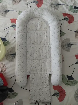 Cojín reductor universal para silla de coche o capazo. A veces, a pesar de que las sillas de coche llevan reductores para recien nacidos no se acaban de adaptar al peque. Este reductor sirve para que queden mas recogidos y la cabeza sujeta. En el capazo sirve para que se sientan arropados sin achicharralos (nosotros lo usamos a finales de primavera-verano. Mi peque en el capazo estaba mucho mas cómodo al sentir contacto. El cojin que se ve suelto sirve para ponerselo debajo del culete y asi quedar más elevado para que el arnes quede mejor alineado. El tejido es de algodon e hipoalergénico. Marca Janabebe