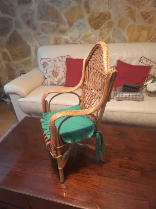 Adorable silla de mimbre, perfecta para los más pequeños. Incluye un cojín verde para mayor comodidad. - Estructura de mimbre tejida. - Cojín de asiento verde con volantes.