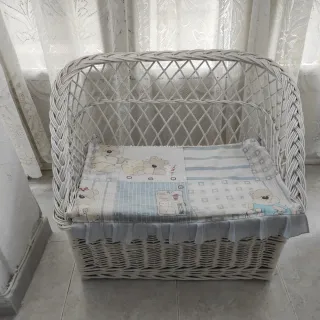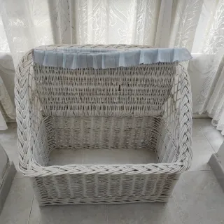 Precioso sofá o cesta de mimbre, ideal para habitación infantil o como juguetero. Medidas 75 x 55 - Estructura de mimbre blanco. - Cojín con estampado de ositos y detalles azules. - Diseño con respaldo curvo