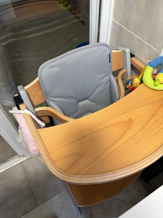 Trona convertible de madera, ideal para las comidas de los más pequeños. - Estructura de madera. - Bandeja de plástico. - Cojín con estampado infantil. Precio negociable