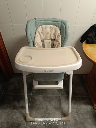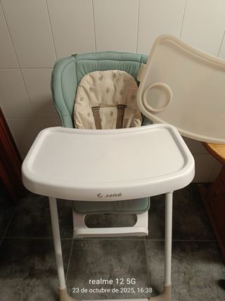 Trona de la marca Jane, ideal para las comidas de los más pequeños. Su diseño es práctico y funcional. - Color verde menta y beige. - Incluye cojín reductor. - Bandeja extraíble.