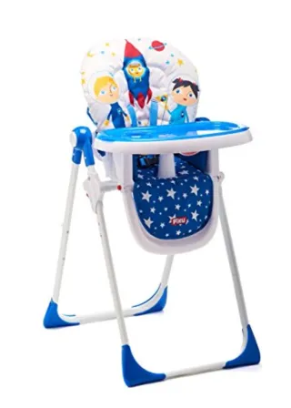 Trona infantil con un divertido diseño espacial. - Cojín acolchado con estampado de estrellas y cohetes. - Personajes de astronautas en el respaldo. - Arnés de seguridad. - Barra separapiernas.