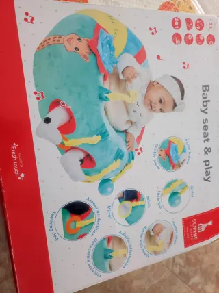 Cojín de actividades Sophie la Girafe, diseñado para el entretenimiento y comodidad del bebé. - Incluye sonajero, espejo y mordedor. - Texturas variadas para estimular los sentidos. - Elementos colgantes para el juego. - Diseño colorido y atractivo.