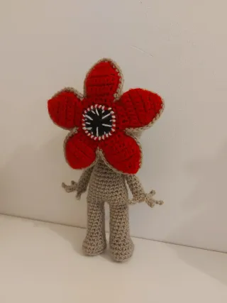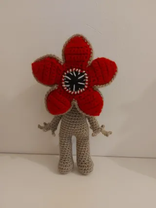 Peluche hecho a mano con técnica de crochet, inspirado en el Demogorgon. - Diseño detallado con pétalos rojos y centro negro con dientes. - Cuerpo y extremidades en color beige. - Ideal para coleccionistas y fans de Stranger Things. Hago este muñeco a crochet, perfecto para amantes de Stranger Things, ya que es una pieza única. Se tarda en tejer de 3 a 5 días y lo hago por encargo. Escríbeme para más información. Aproximadamente mide 20cm.
