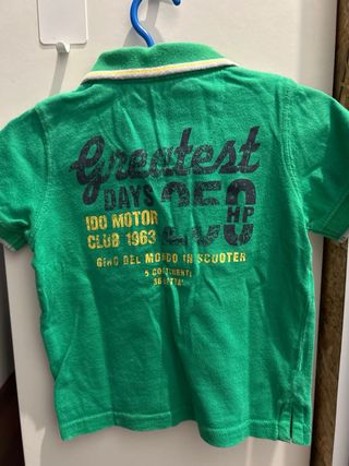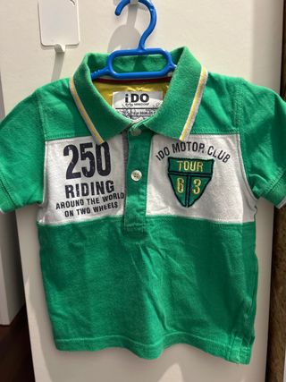 Polo de manga corta para niño con un diseño llamativo. - Color verde con detalles blancos y amarillos. - Estampado frontal 250 RIDING AROUND THE WORLD ON TWO WHEELS. - Insignia IDO MOTOR CLUB TOUR 63 en el pecho.