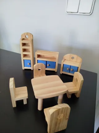 Conjunto de muebles de madera para casa de muñecas, ideal para coleccionistas o para jugar. - Incluye mesa y sillas. - Varias estanterías y armarios pequeños con cajones azules. - Material: Madera natural.
