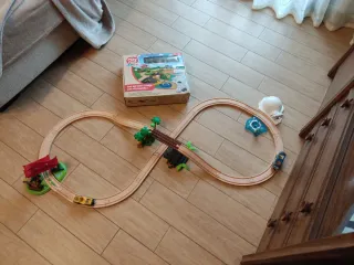 Conjunto de tren de madera con vías y accesorios para crear un circuito. Con su caja original, poco uso. - Vías de madera curvas y rectas. - Puente. - Árboles. - Casa. - Trenes pequeños. - Personajes