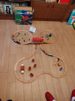 Conjunto de tren de madera de Imaginarium con accesorios de ciudad. En su caja original. - Incluye vías de tren de madera. - Estación de tren con techo rojo. - Varios edificios y árboles de juguete. - Trenes de juguete de diferentes colores. Añadimos otro tren con sus vías y accesorios para completar, es compatible en las uniones y rodadas.