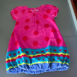 Vestido infantil de la marca Ágatha Ruiz de la Prada. Talla 6 años. - Color rosa fucsia con estampado de lunares rojos. - Fajín con diseño de corazones y ondas en tonos azul, amarillo y rojo. - Bajo fruncido con cordón elástico.