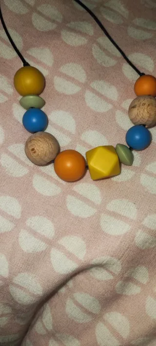 Collar de lactancia con cuentas de silicona en varios colores y formas. Ideal para bebés. - Cuentas de silicona de grado alimenticio. Libre de BPA - Diseño seguro y atractivo. - Fácil de limpiar. Lavar con agua y jabón En perfecto estado, casi sin uso. Collar con doble función: entretiene al bebé mientras está lactando y calma las molestias de la dentición porque las piezas de silicona se pueden morder - Broche de click que se abre si el bebé estira del collar para evitar daños en el cuello de la mamá - Se pueden enfriar en la nevera para un mayor alivio de las molestias de la dentición