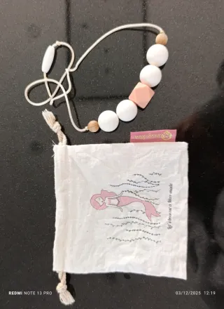 de silicona, libre de BPA, montado a mano. Tambien sirve de mordedor