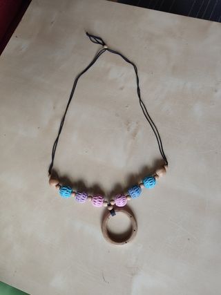 Collar de lactancia, de madera, con bolas recubiertas de ganchillo y un aro colgando. bebé, lactancia, dentición, niño, niña, infantil, colgante