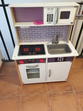 Divertida cocina de juguete para niños, con diseño moderno y acabados en madera y blanco. - Incluye horno, microondas, fregadero y fogones. - Panel de control con botones y pantalla. - Grifo y accesorios decorativos.