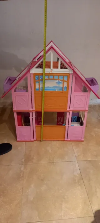 Mansión de Barbie de varias plantas con balcones y habitaciones. - Estructura de plástico rosa y blanco. - Balcones con barandillas. - Incluye muebles y accesorios. - Barbie y maletas.