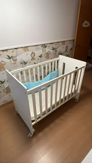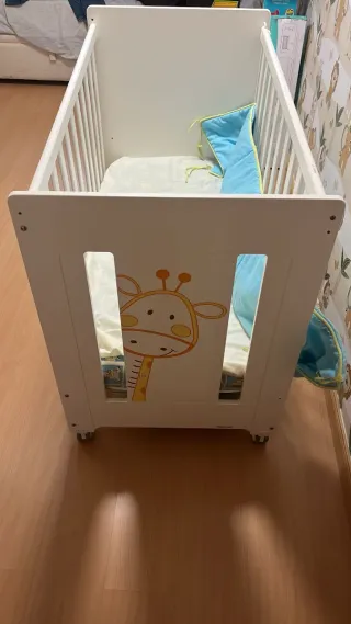 Cuna de bebé en color blanco con dibujo de jirafa, está en perfecto estado, Cuenta con un diseño práctico y seguro. Barandilla con dos alturas para mayor comodidad. Todo 70€ -Bañera cambiador plegable. - Estructura de madera blanca. - Ruedas para fácil movilidad. -Cajón para almacén - Incluye protector de cuna azul. - colchón -Edredon+ colcha - 2 Protectores colchón+ 2 sábanas bajeras+ juego de sabanas+ Almohada.