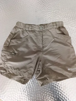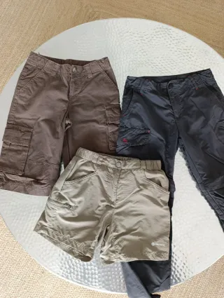 Conjunto de pantalones y shorts de senderismo para niño. Los de marca Mountain son talla 10. Los otros dos miden lo mismo de cintura (mirar foto con medida). Corté la etiqueta porque incomodaba. - Pantalones largos desmontables, se hacen cortos (mirar última foto) en color gris oscuro. Marca Quechua. - Pantalones marrones cortos con bolsillos. Marca Quechua. - Pantalones cortos en verde caqui claro. Marca Mountain.