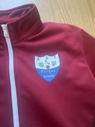 Sudadera deportiva de color granate con detalles en blanco y burdeos. Presenta el logo de Macron en blanco en el pecho izquierdo y el escudo del Parque Sureste en el pecho derecho. - Talla XS. - Cierre de cremallera completo. - Cuello alto.