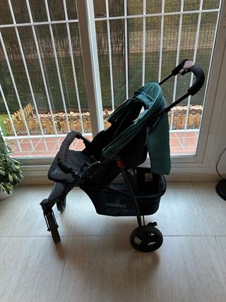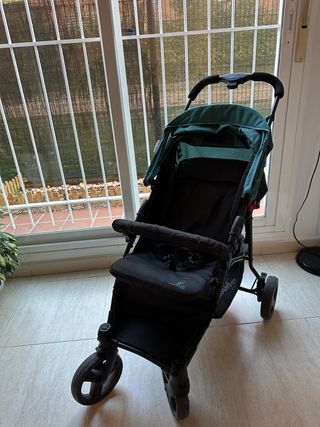 Carrito de bebé en color verde y negro. Es ligero y fácil de manejar. - Capota ajustable. - Asiento acolchado. - Ruedas delanteras giratorias.