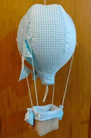 Precioso globo decorativo, ideal para habitaciones infantiles o como regalo. - Diseño de globo aerostático. - Tejido de cuadros y lunares en tonos celestes. - Hecho a mano. - Cesta de yute. - Adornos en forma de banderines y saquitos.