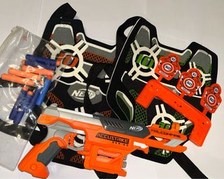Pack de juego Nerf AccuStrike FalconFire que incluye pistola, dardos y dianas. - Pistola Nerf AccuStrike FalconFire. - Dardos de espuma (varios colores). - Dianas de objetivo con puntuación.