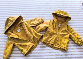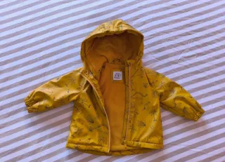 Conjunto de dos chaquetas impermeables amarillas con estampado de dinosaurios y palmeras, perfectas para los más pequeños. - Talla: 12/18 meses (86cm). - Color: Amarillo. - Diseño: Estampado de dinosaurios y palmeras. - Cierre: Cremallera delantera. - Capucha: Sí. - Interior: Forro suave.