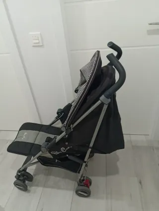 Carro de paseo ligero y práctico, ideal para llevar a los más pequeños. - Diseño plegable para fácil transporte. - Capota con estampado. - Arnés de seguridad de 5 puntos. - Ruedas delanteras giratorias.
