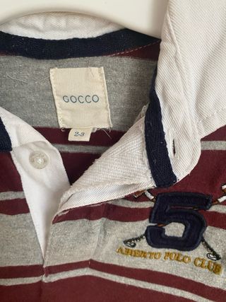 Polo de manga larga de la marca Gocco con un diseño de rayas. - Rayas horizontales en color burdeos y gris. - Cuello blanco de polo. - Detalle de número 5 bordado y texto 'ABERTO POLO CLUB'.