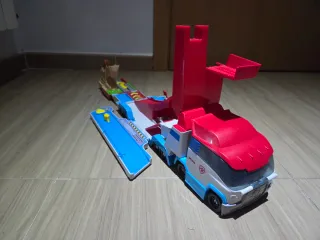 Camión de juguete de la Patrulla Canina. - Diseño en color rojo, blanco y azul. - Incluye detalles del Paw Patrol. - Ruedas visibles en la parte inferior.