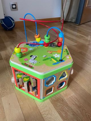Juego manipulativo de madera con forma hexagonal para bebés. Fomenta el desarrollo de la motricidad fina y la coordinación. - Diseño con animales de la selva. - Incluye cuentas para deslizar. - Engranajes giratorios. - Ruedas para mover.