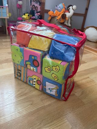 Set de cubos blandos para bebés, perfectos para el desarrollo y la diversión. - Incluye varios cubos con diferentes diseños y colores. - Material suave y seguro para los más pequeños. - Vienen en una bolsa de plástico transparente con cremallera para guardarlos fácilmente.
