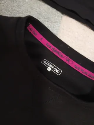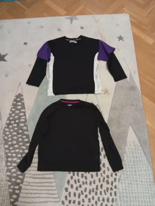 Lote de dos prendas de ropa para niño, talla 8-10 años. - Una camiseta negra con detalles blancos y mangas moradas. Zara - Una sudadera negra de manga larga. Boomerang