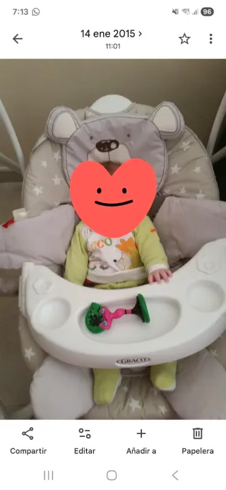 Hamaca Columpio Graco de tres posiciones. La hamaca tiene vibración si quieres; para que el bebé se relaje, al mío le encantaba. Tiene varios modos de melodías; y velocidades de balanceos. Es totalmente desmontable y las telas lavables en lavadora.