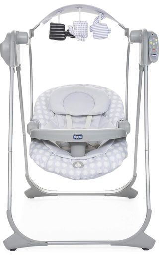Balancín columpio para bebé Chicco Polly Swing Altalena. Ideal para los más pequeños. - Incluye cojín reductor acolchado. - Capota. - Barra de juegos. - Módulo musical y de luces. - Vaivén automático 3 velocidades.