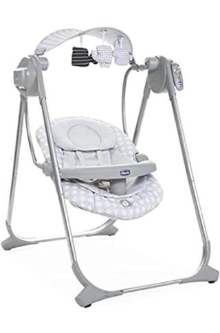 Columpio Chicco Diseñado para que pueda jugar y relajarse en una posición elevada, tanto en interiores como en exteriores. Tiene un mando a distancia para controlar el movimiento de balanceo. El cojín se puede ajustar a dos alturas diferentes para adaptarse al crecimiento del bebé. Incluye una capota ajustable práctica que cuenta con tres juguetes colgantes extraíbles