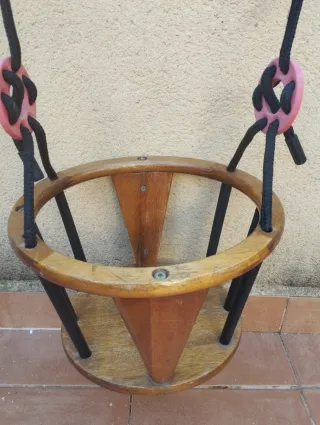 Nunca usado ni montado. En perfectas condiciones. Columpio de madera para bebés y niños, ideal para interiores o exteriores. - Fabricado en madera natural. - Cuerdas resistentes y seguras. - Asiento de madera con barras de protección. - Cuentas de colores para estimular al bebé.