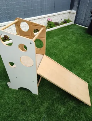 Torre de aprendizaje evolutiva Leea, inspirada en la pedagogía Montessori que se convierte en banco, mesa para pintar, trona, tobogán, columpio y pizarra. - Fabricada en madera. - Diseño con múltiples aberturas circulares. - Incorpora una rampa y columpio. - Pizarra. - Mesa para pintar, comer, etc. - Estructura estable y segura. Medidas: 42/50/98 cm Precio original: 180€ torre + 60€ tabla pizarra/tobogán + 60€ columpio + gastos envío= 350€ No negociable. Venta en mano.