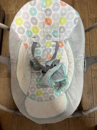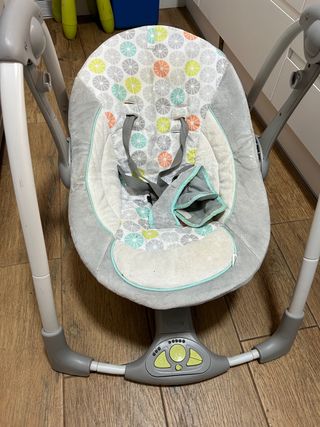 Columpio portátil de la marca Ingenuity. Ideal para bebés. - Diseño moderno y funcional. - Asiento acolchado con arnés de seguridad. - Estructura plegable para fácil almacenamiento y transporte.