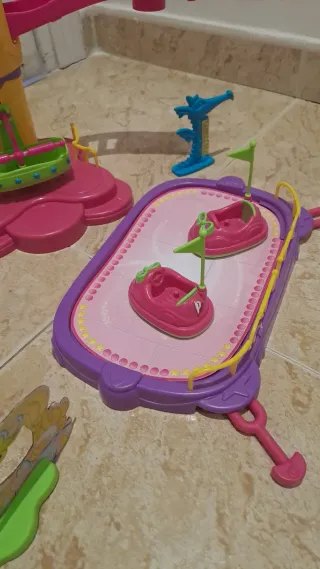 Conjunto de juegos del parque de atracciones de Pin y Pon. Incluye varias atracciones para horas de diversión. - Atracción de caída libre con forma de helado. - Casa de juegos con columpio. - Pista de coches de choque. - Carro de feria. - Figuras decorativas.